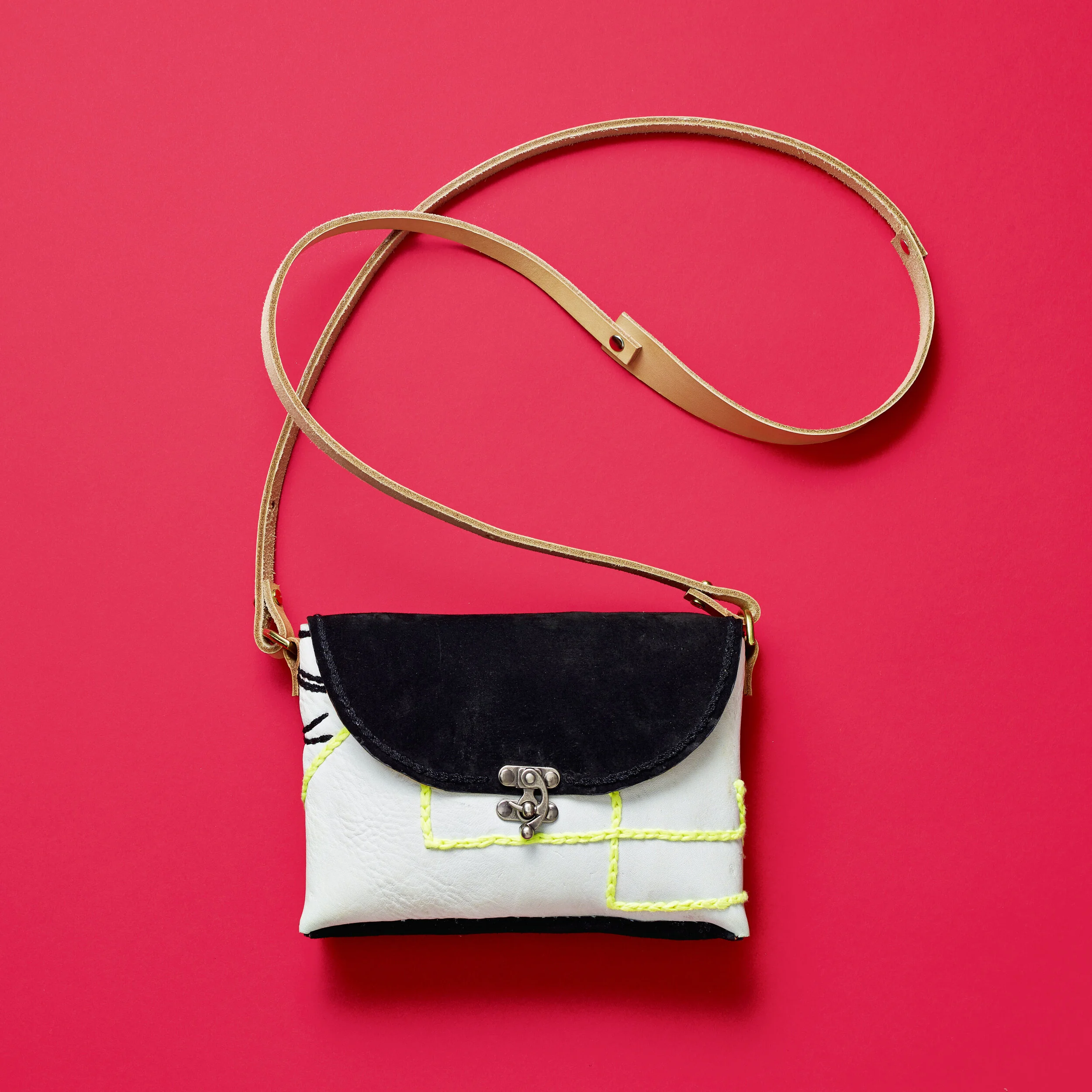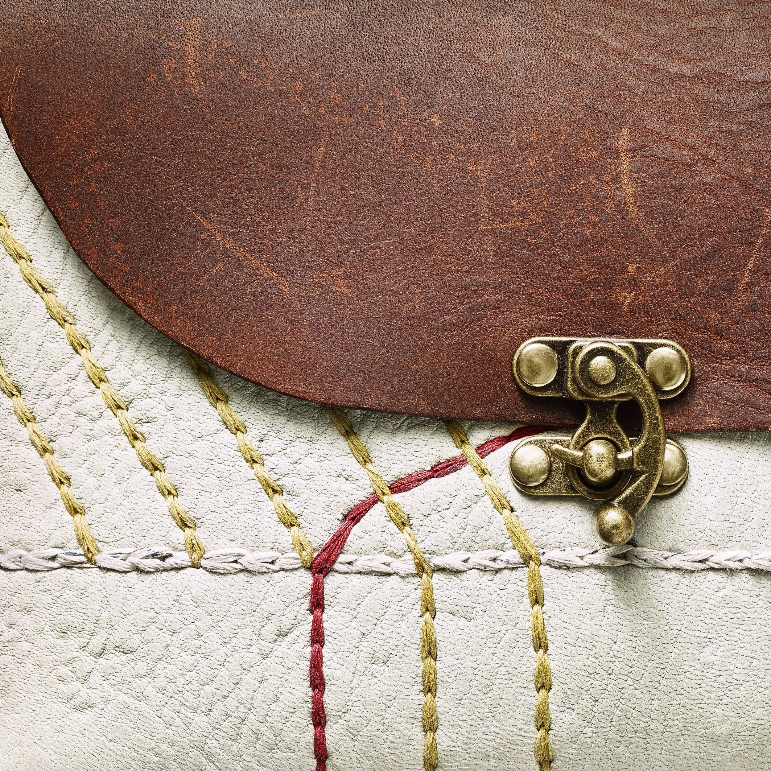 One-of-a-kind handbags created from discarded pieces of leather, considered defective because they bear surface imperfections. Each bag has unique stitching patterns that follow the surface imperfection markings on the hyde.