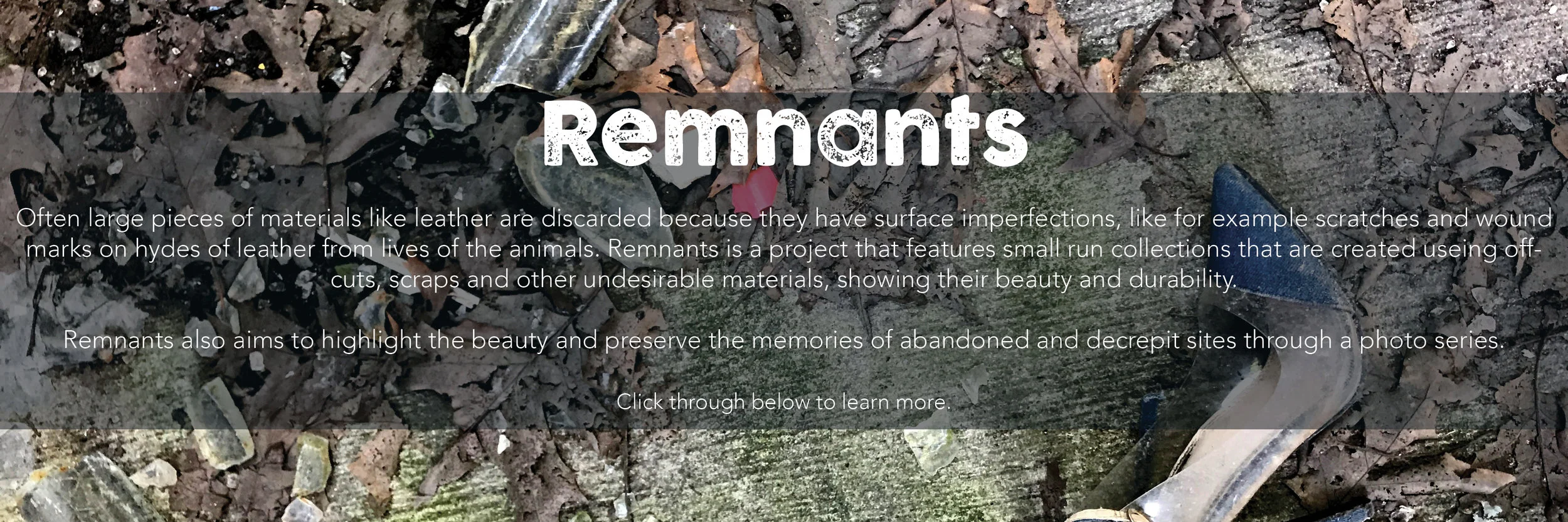 Often large pieces of leather are discarded because they have surface imperfections, like scratches and wound markings from the lives of the animals. Inspired by my experiences as a busy urban creative who yearns for comfort, style and utilitarian function, I created Remnants, a collection of hand-crafted leather accessories, that were designed to fulfill specific needs, while also highlighting both the durability and unique beauty of these less desirable pieces of leather.